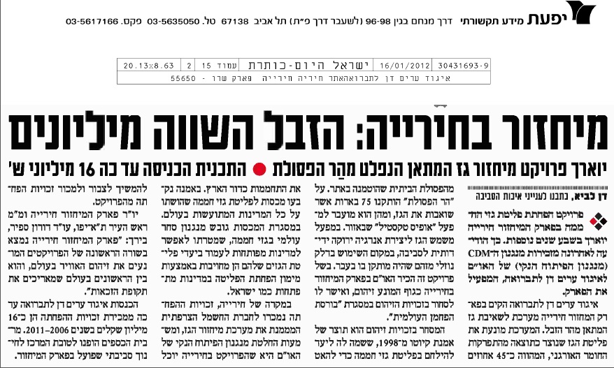 פרויקט מחזור גז המתאן הנפלט מהר הפסולת יוארך ב-7 שנים נוספות, כך הודיעה לאחרונה מזכירות מנגנון ה-CDM (מנגנון הפיתוח הנקי) של האו"ם. עו"ד דורון ספיר, יו"ר פאר המיחזור חירייה ומ"מ ראש העיר ת"א-יפו: "פארק המיחזור חירייה נמצא בשורה הראשונה של הפרוייקטים המונעים את זיהום האוויר בעולם והוא בין הראשונים בעולם שמאריכים את תקופת הזכאות".