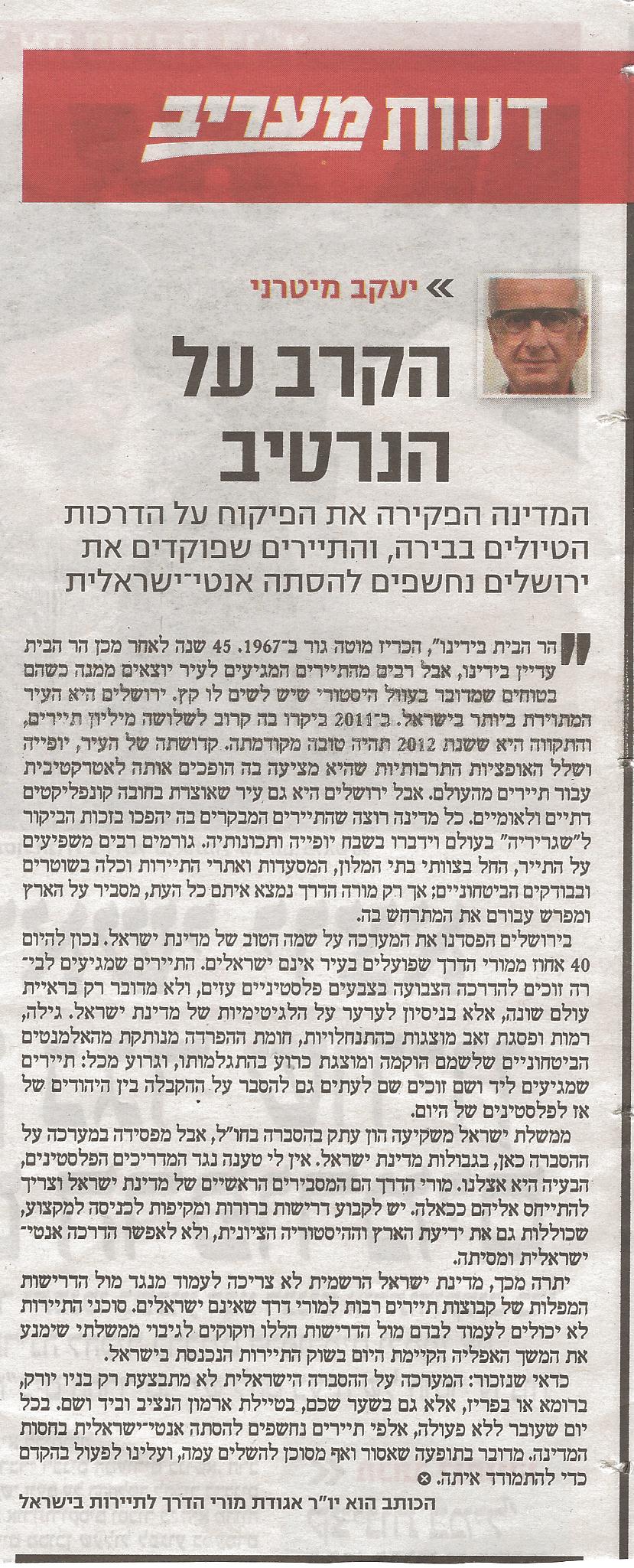 "המדינה הפקירה את הפיקוח על הדרכות הטיולים בבירה, והתיירים שפוקדים את ירושלים נחשפים להסתה אנטי-ישראלית". יעקב מיטרני, יו"ר אגודת מורי הדרך לתיירות בישראל", בטור דעה במעריב.