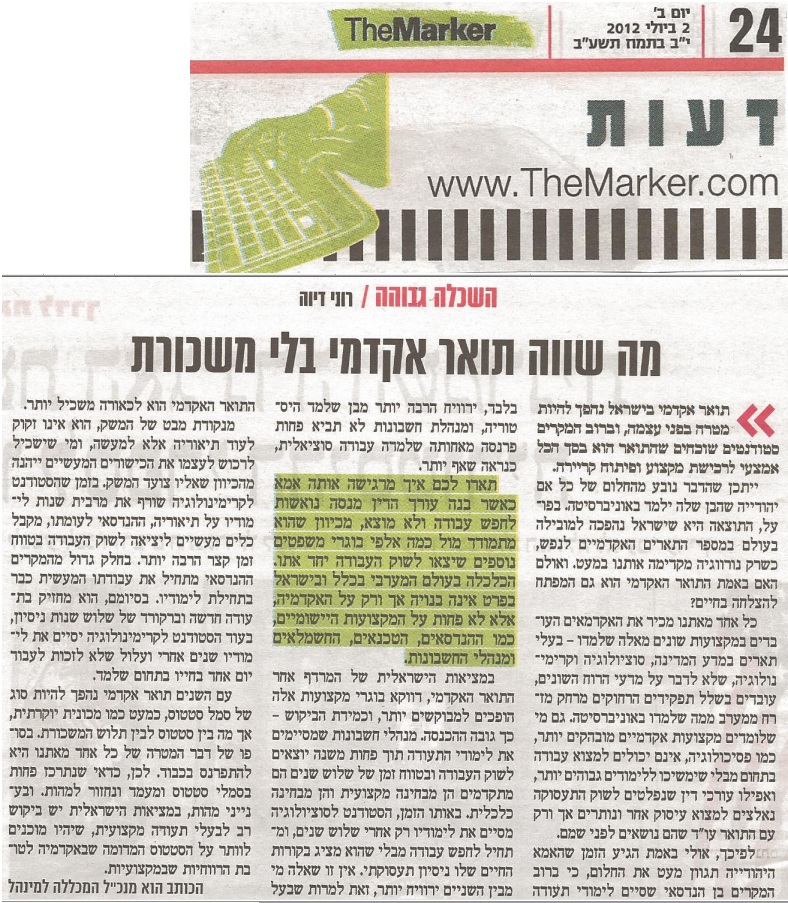 "תארו לכם איך מרגישה אותה אמא כאשר בנה עורך הדין מנסה נואשות לחפש עבודה ולא מוצא, מכיוון שהוא מתמודד מול כמה אלפי בוגרי משפטים נוספים שיצאו לשוק העבודה יחד איתו. הכלכלה בעולם המערבי בכלל ובישראל בפרט אינה בנויה אך ורק על האקדמיה, אלא לא פחות על המקצועות היישומיים, כמו ההנדסאים, הטכנאים, החשמלאים ומנהלי החשבונות". רו"ח רוני דיוה, מנכ"ל המכללה למינהל, בטור דעה שפורסם הבוקר בדה-מרקר.