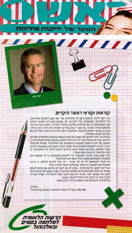 מתוך כתבה שפורסמה בגיליון מיוחד של מגזין ראש1, בשיתוף הרשות הלאומית למלחמה בסמים ובאלכוהול.