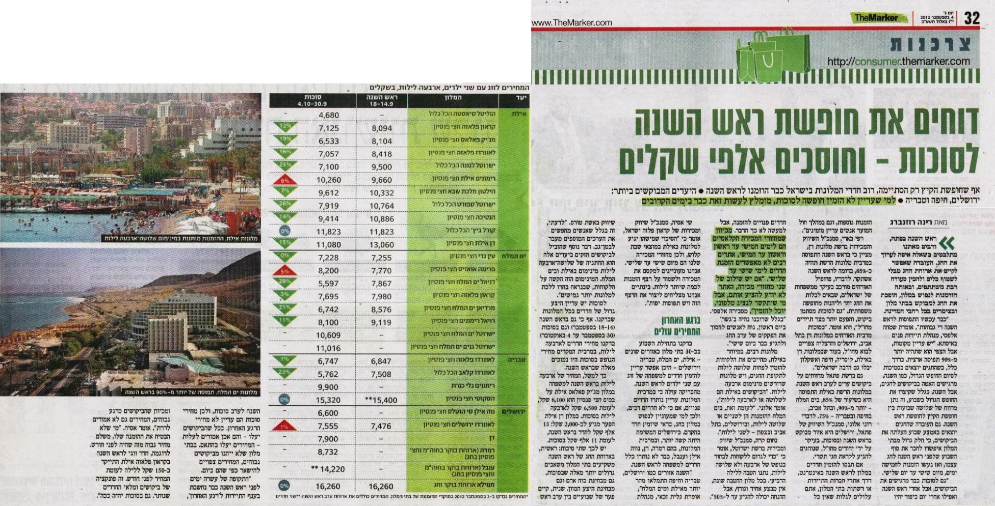 דוחים את חופשת ראש השנה וחוסכים אלפי שקלים: אף שחופשת הקיץ רק הסתיימה, רוב חדרי המלונות בישראל כבר הוזמנו לראש השנה. למי שעדיין לא הזמין חופשה לסוכות, מומלץ לעשות זאת כבר בימים הקרובים. "כבר עכשיו התפוסות לראש השנה די גבוהות", אומרת שמחה אלפסי, מנהלת תיירות פנים באיסתא. "יש עדיין מקומות, אבל הצפי הוא שתהיה יותר מ-90% תפוסה ארצית"