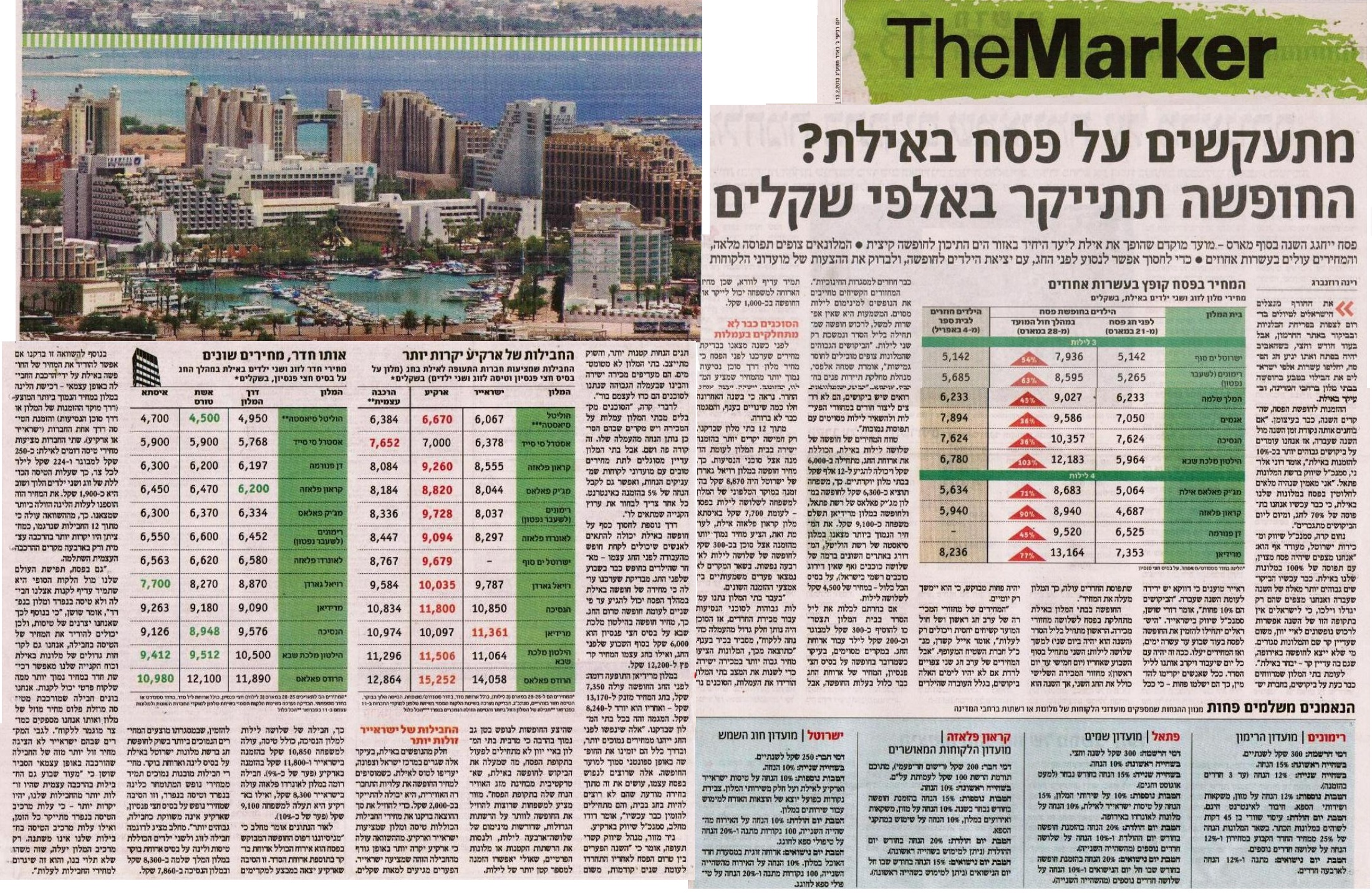 פסח ייחגג השנה בסוף מארס – מועד מוקדם שהופך את אילת ליעד היחיד באזור הים התיכון לחופשה קיצית. המלונאים צופים תפוסה מלאה, והמחירים עולים בעשרות אחוזים. כדי לחסוך אפשר לנסוע לפני החג, עם יציאת הילדים לחופשה, ולבדוק את ההצעות של מועדוני הלקוחות. "הביקושים הגבוהים שהמלונות צופים מובילים לחוסר גמישות", אומרת שמחה אלפסי, מנהלת מחלקת תיירות פנים בחברת איסתא. "ברגע שהמלונאים רואים שיש ביקושים, הם לא רוצים ליצור חורים במחזורי הפעילות ולהשאיר לילות מסוימים עם תפוסות נמוכות".