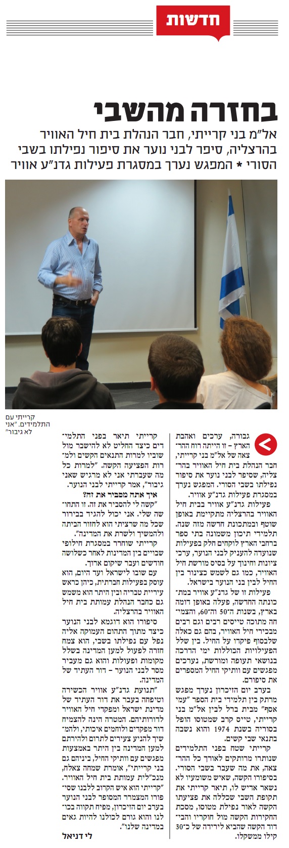 אל"מ בני קרייתי, חבר הנהלת בית חיל האוויר בהרצליה, סיפר לבני נוער את סיפור נפילתו בשבי הסורי. המפגש נערך במסגרת פעילות גדנ"ע אוויר.