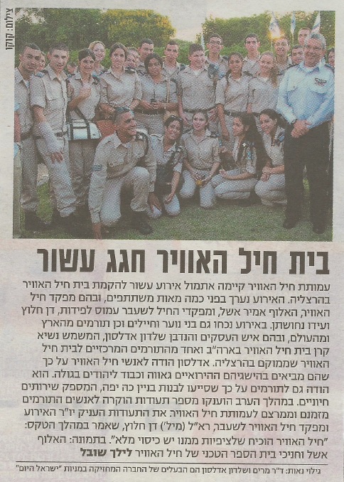 עמותת בית חיל האוויר קיימה אירוע עשור להקמת הבית בהרצליה. האירוע נערך בפני כמה מאות משתתפים, ובהם מפקד חיל האוויר, האלוף אמיר אשל, ומפקדי חיל האוויר לשעבר עמוס לפידות, דן חלוץ ועידו נחושתן. באירוע נכחו גם בני נוער גדנ"עים, שוחרים, חיילים וכן תורמים, ביניהם שלדון אדלסון המשמש נשיא קרן בית חיל האוויר בארה"ב.