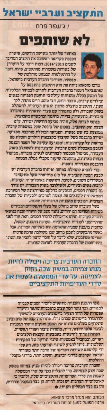 "החברה הערבית צריכה ויכולה להיות מנוע צמיחה במשק שכה זקוק לצמיחה. על שרי הממשלה לשנות את סדרי העדיפויות התקציביים". ג'עפר פרח, מנהל מרכז מוסאוא, ארגון הפועל למען זכויות הערבים בישראל, בטור דעה על התקציב ועל ערביי ישראל.