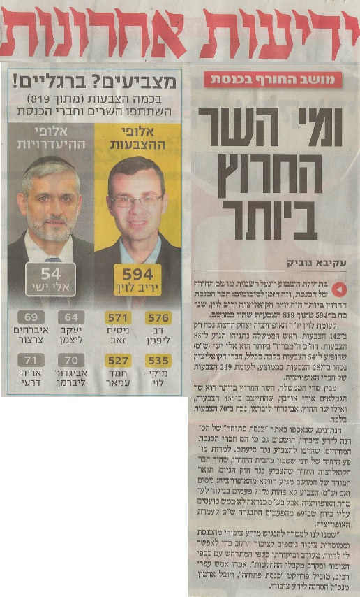בתחילת השבוע ינעל רשמית מושב החורף של הכנסת, וזה הזמן לסיכומים: חבר הכנסת החרוץ ביותר הוא יו"ר הקואליציה יריב לוין, שנכח ב-594 מתוך 819 הצבעות שהיו במושב. הנתונים נאספו באתר "כנסת פתוחה", של הסדנה לידע ציבורי.
